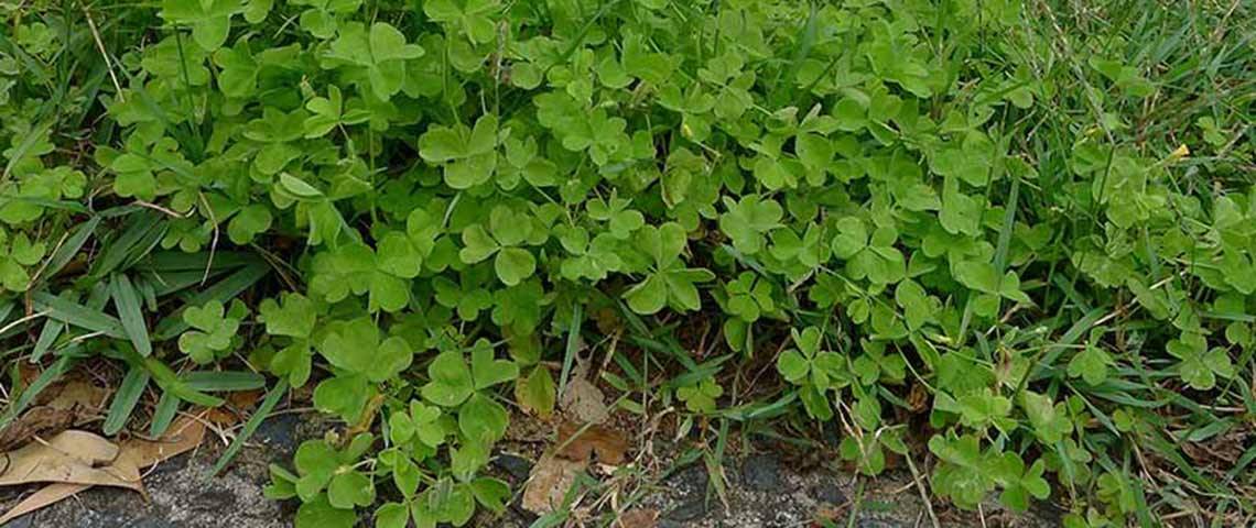 Oxalis is a broadleaf perennial weed that, left unchecked, comes back from the roots year after year. Each distinctive shamrock-like leaf has three heart-shaped leaflets outlined with tiny hairs. Depending on the plant, oxalis leaves are deep green, purple-red or both. At night and during times of stress, the creased leaflets fold inward, held on leaf stalks up to 3 inches long. Oxalis stems may be hairy or smooth and range in color from greenish-pink to red.